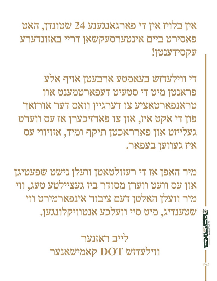 Mr. Stern and Mr. Ekstein are not providing any information to the English speaking members of the community about the situation, while simultaneously lying to the Yiddish speaking members of the community about what’s going on with the road.
