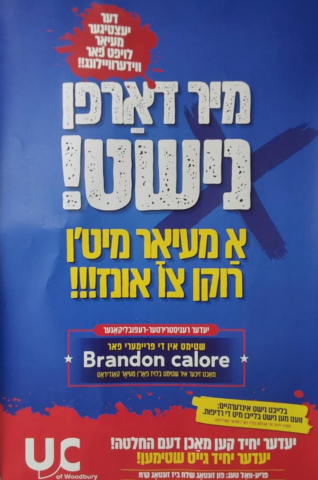 Pictured Above: The United Jewish Community of Woodbury, which has verifiable connections with Joel Stern and Isaac Ekstein’s scam organization in South Blooming Grove, is endorsing Brandon Calore in Woodbury’s Republican Mayoral Primary. Mr. Calore was recently employed with CIOFFI, a company that does a lot of business with the unelected co-mayors of South Blooming Grove. To this day, Brandon Calore refuses to provide any financial information for his mayoral campaign, but is the primary beneficiary of State Senator James G. Skoufis’s Protect Monroe-Woodbury mailers and website.