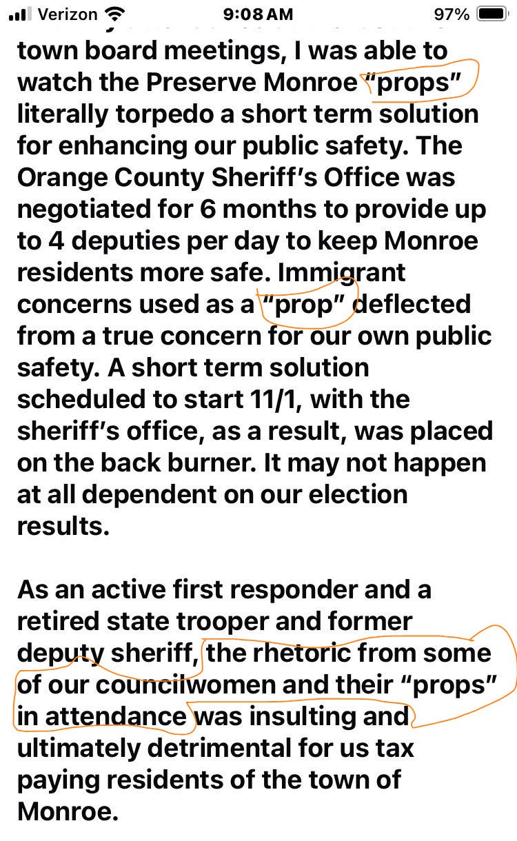 I know it’s a Thursday night and short notice, but if you can be there, I encourage you to come. Even if only to tell people like former NYS Trooper Rob Furbeck that the “props” he was calling out on Facebook have voted, and those “props” want the village police department to protect the people of Monroe, not the MAGA-funded sheriff’s department. (Found below, little of what Mr. Furbeck has to say about the Sheriff’s contract is accurate, but you probably figured that out at this point.)