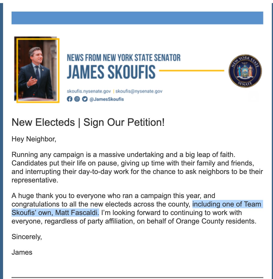 Pictured Above: Today’s newsletter from State Senator James G. Skoufis makes only one mention to South Blooming Grove’s stolen election, a link to the News 12 article, and absolutely nothing else. Instead, Skoufis praises one of very few candidates his alleged booty call, Orange County Democratic Chair, Zak Constantine, bothered to put any effort into supporting.