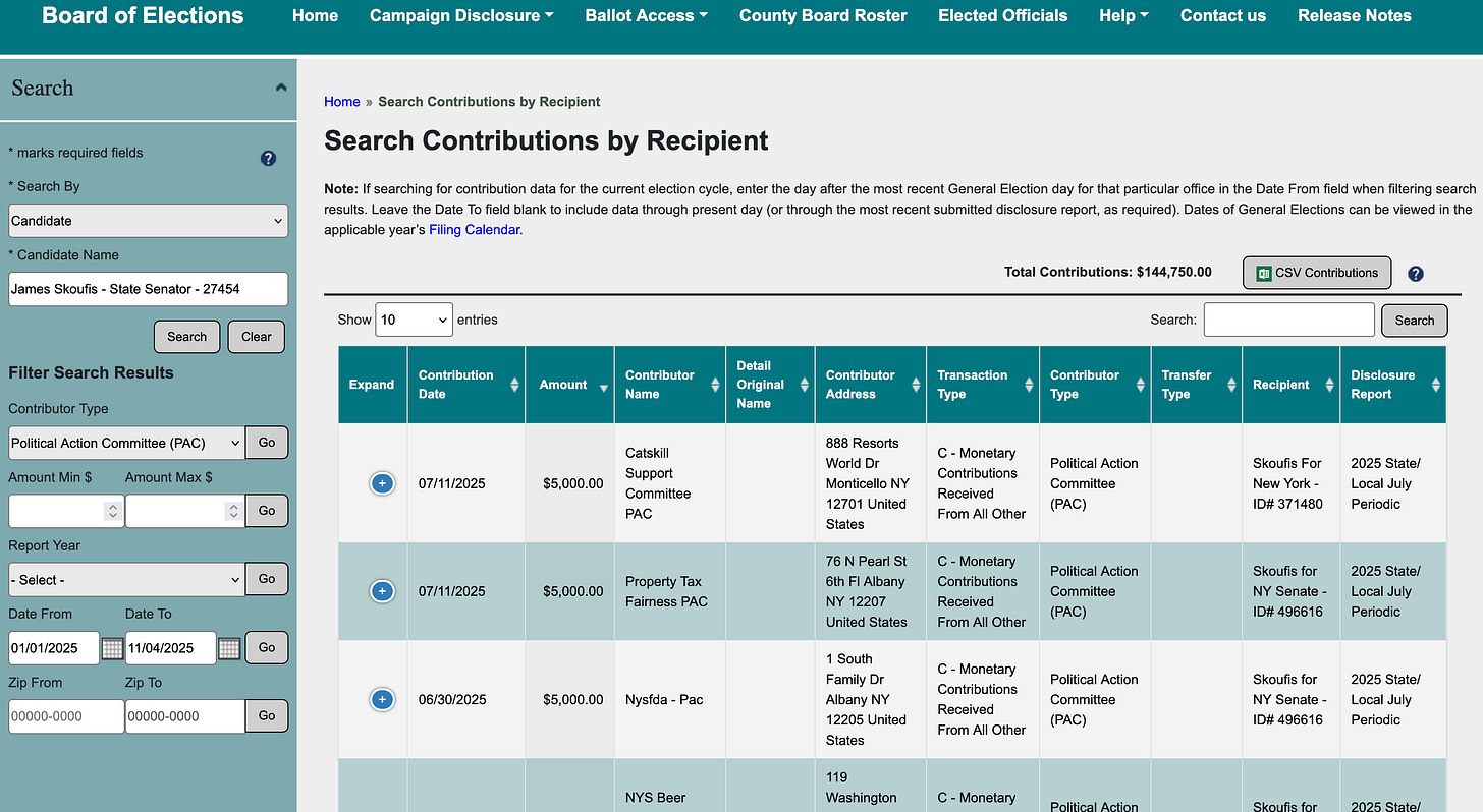 Vernick, by the way, was not endorsed by State Sen. James G. Skoufis, who instead supported the losing candidates: David Yoffee on the town side, and Brandon Calore, Matthew and Rhonda Fabbro, and James Freiband on the village side. Calore, as a reminder, is a Far-Right MAGA bigot who was credibly accused of assaulting a disabled teenager in an ice cream shop parking lot. This is the man Mr. Skoufis spent $19,600 supporting this year.