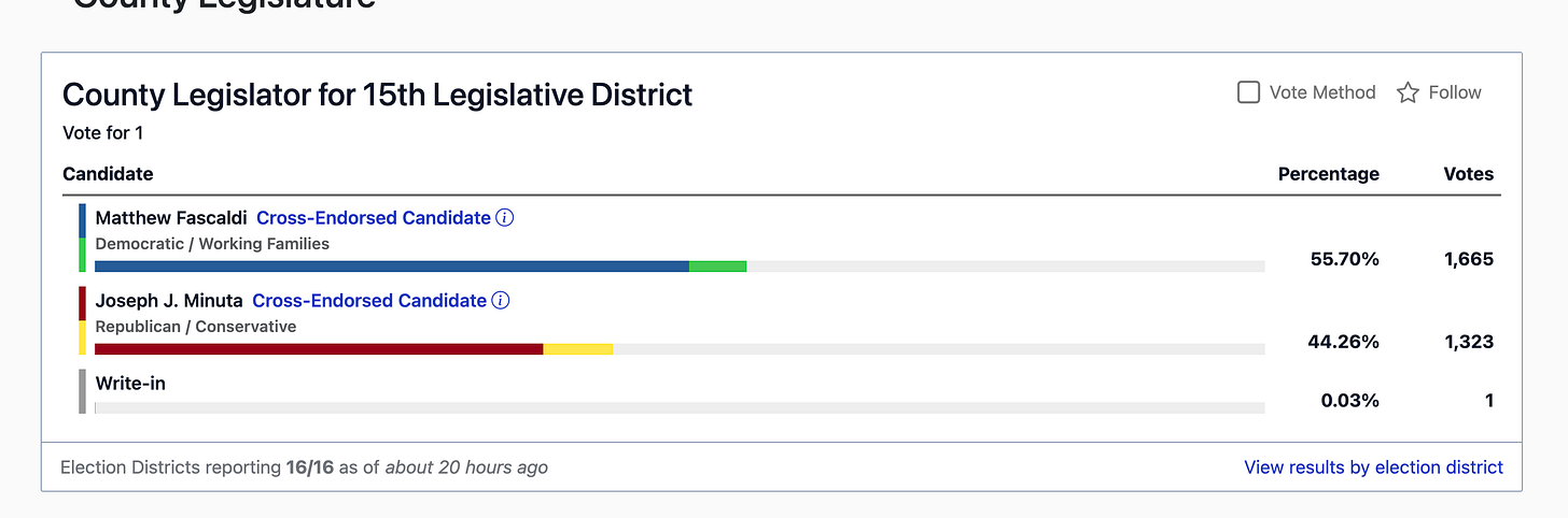 You can see this lack of effort by the Orange County Democrats in how people voted across the county for Michael Sussman. Voters in Monroe, for example, supported Councilwoman Richardson but did not vote for Sussman in most districts. The same was true in Woodbury, where in nearly every district, regardless of mayoral choice, voters selected Neuhaus for county executive instead of Michael Sussman.