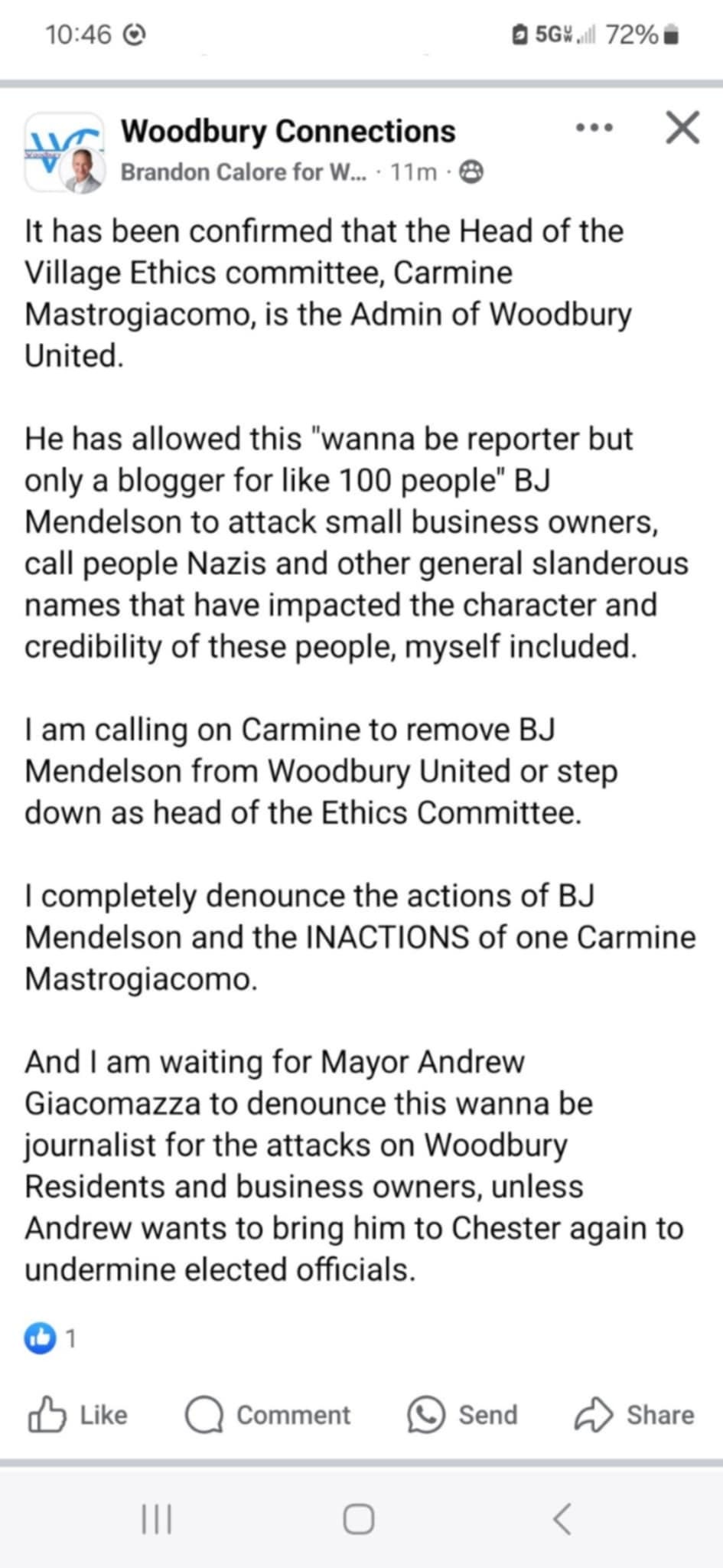 Mr. Calore is, once again, factually inaccurate. I am the Admin for Woodbury United. Not Mr. Mastrogiacomo.