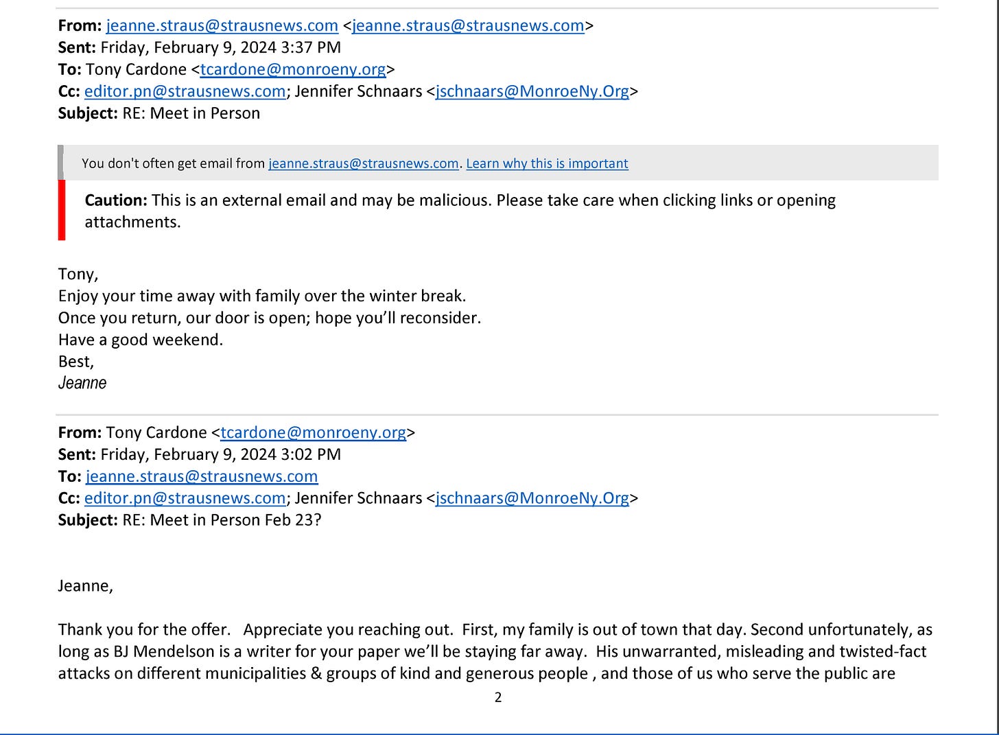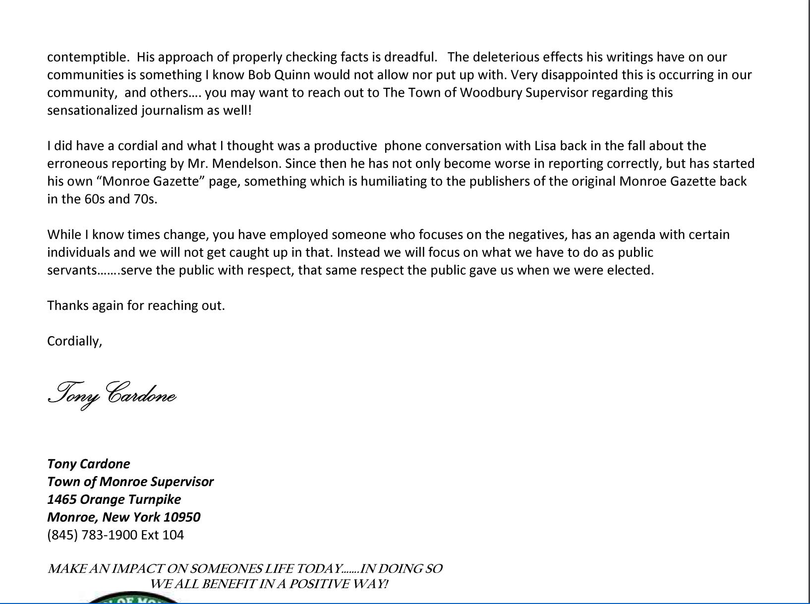 This is part of a larger pattern of behavior, where Cardone asks Monroe residents to email him, and then he rarely (if ever) replies. We saw this pattern of behavior in action concerning the residents who live on Hawxhurst road, who notified the Supervisor repeatedly about the school buses, only to be ignored. (With one exception.)