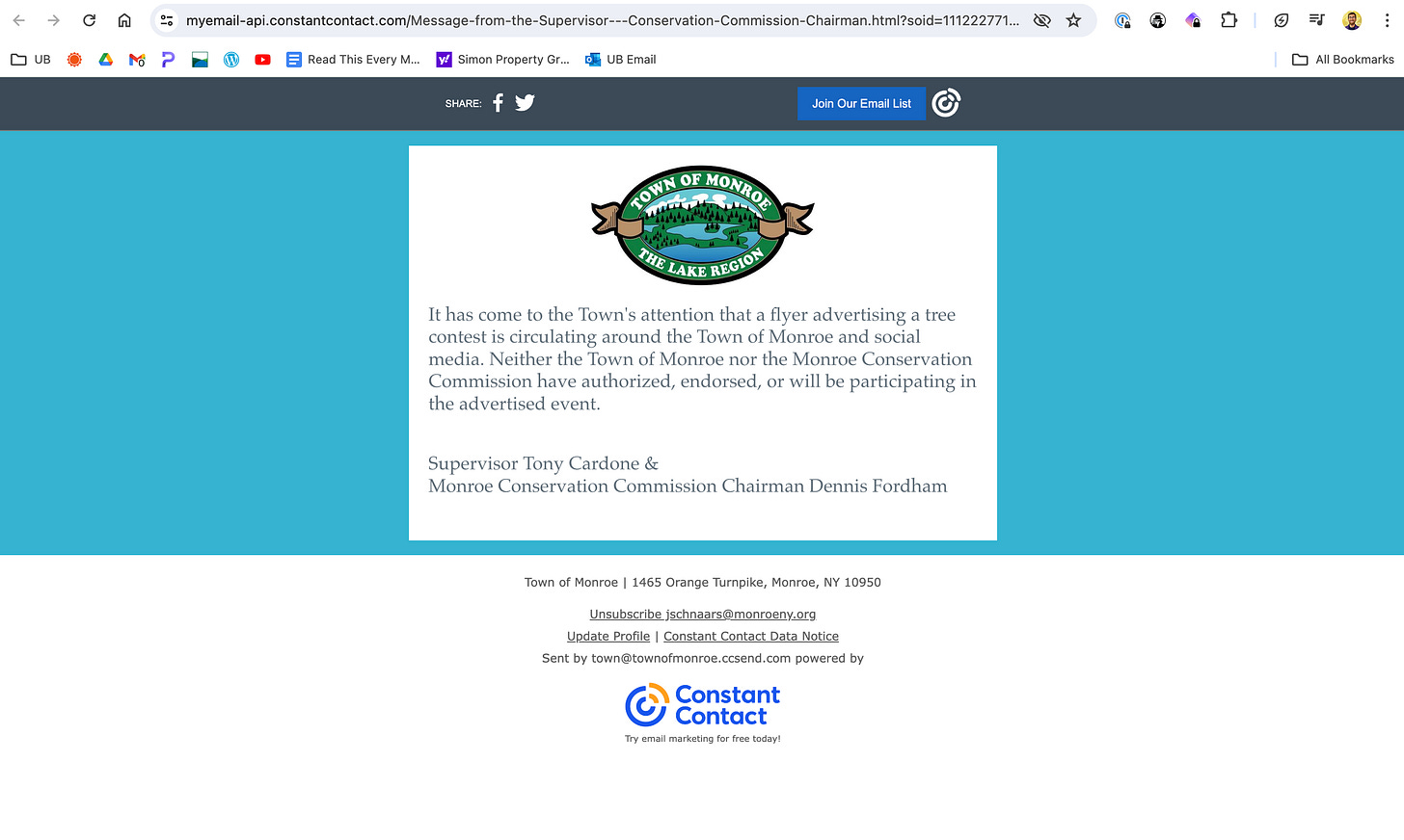 First, that the Monroe Conservation Committee did not approve the tree contest. They absolutely did. Mr. Dennis Fordham, like many who work or volunteer for the town, was bullied by Herr Cardone into giving a false statement.
