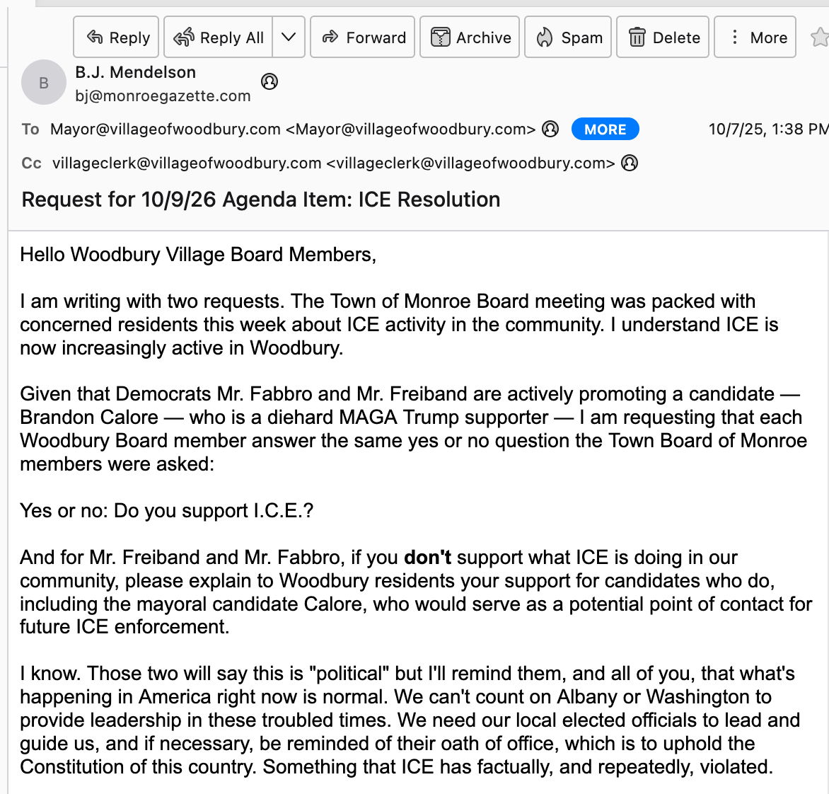So, back on October 7, 2025, The Monroe Gazette reached out to the Woodbury Village Board concerning whether its current members support the activities of ICE; and whether the Village Board would introduce a resolution calling on Assemblyman Chris Eachus and State Senator James G. Skoufis to call for an emergency session of the legislature. One where they can demand passage of the New York For All and New York MELT acts. (This, for the record, is a question that should be asked again at upcoming Town of Woodbury and Village of Woodbury meetings after everyone has had a chance to dig out from the snow. Monroe got well over 20 inches. I know this because, at the moment, it’s impossible to open the mailbox.)