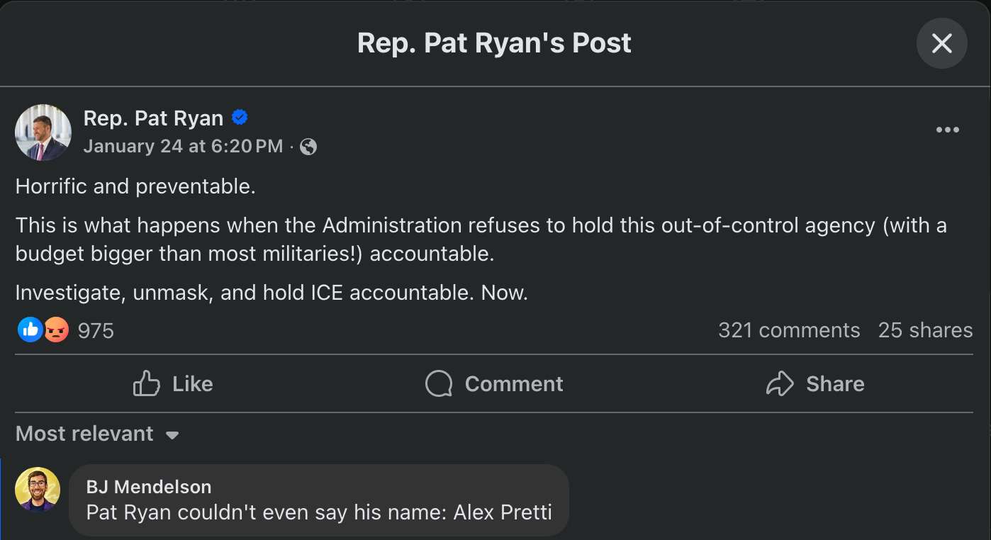 But you can, and should, also call Ryan out for him not supporting the impeachment of Kristi Noem, the impeachment of Pete Hegseth, the impeachment of Donald Trump, and the abolishment of ICE and DHS. (All things Ryan does not support as of this writing.)