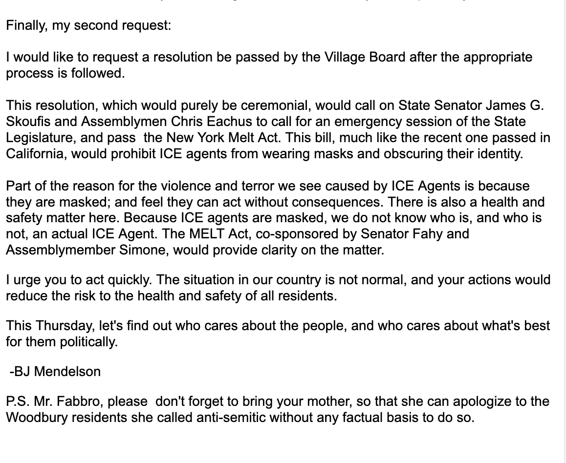 At no point after receiving this email did Matthew Fabbro, his mother Rhonda (the actual village trustee as far as she was concerned), and James Freiband discuss ICE, call for any resolutions to be passed, or express sympathy for Woodbury residents rounded up by ICE, despite the fact that they remained in power until January 1, 2026.