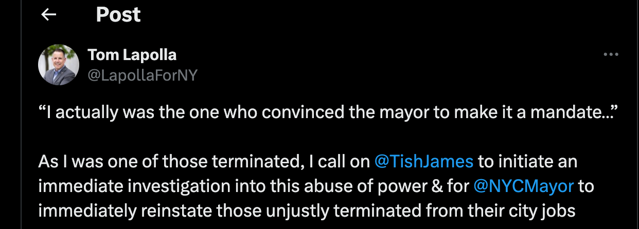 We need to talk about Mr. Lapolla’s repeated claim that he was “fired” from the FDNY because he refused to get a COVID-19 vaccination.