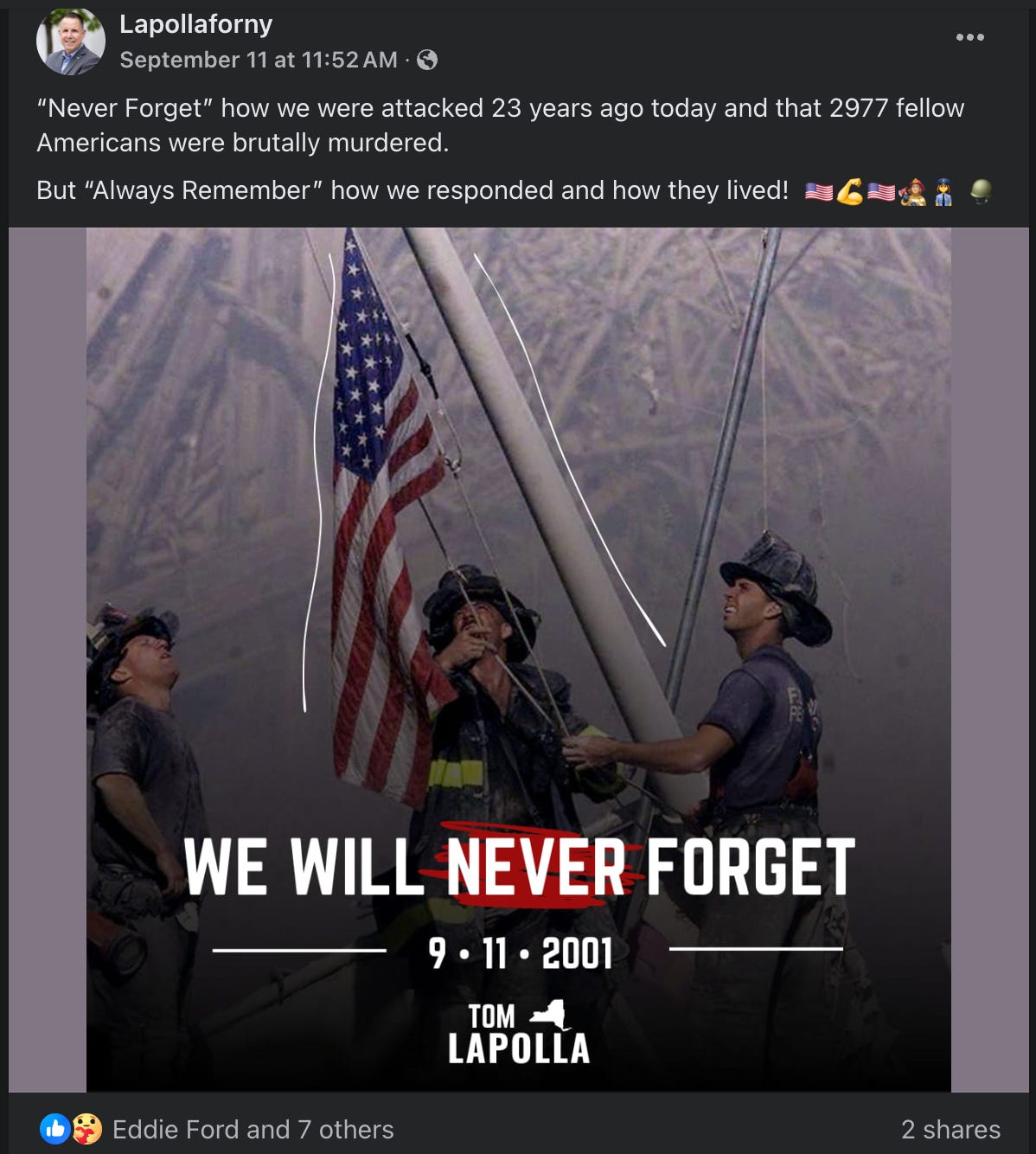 Above: A convicted felon and insurrectionist poses for a photo with New York State Assembly candidate, Tom Lapolla, on the anniversary of 9/11 in New York City. Lapolla was an FDNY Battalion Chief until he was “fired” for refusing to get the COVID-19 vaccination. In reality, according to a spokesperson from the FDNY, Mr. Lapolla retired after 38 years of service. He was not fired.