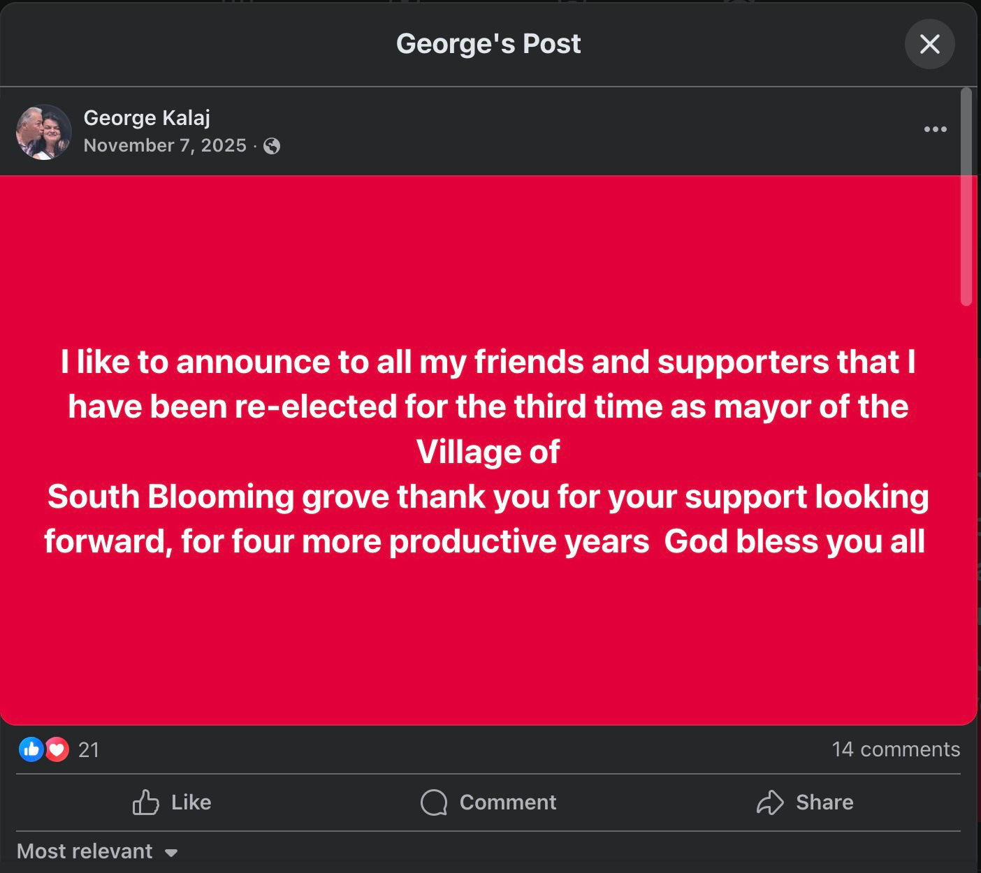“She just found out today that the Village held an election for mayor and two trustees yesterday. She received a call from a friend today that there was an election. There was a meeting this Monday [October 20, 2025] and there was no mention of an election occurring Wednesday.” -phone call summary to my office dated October 24, 2025