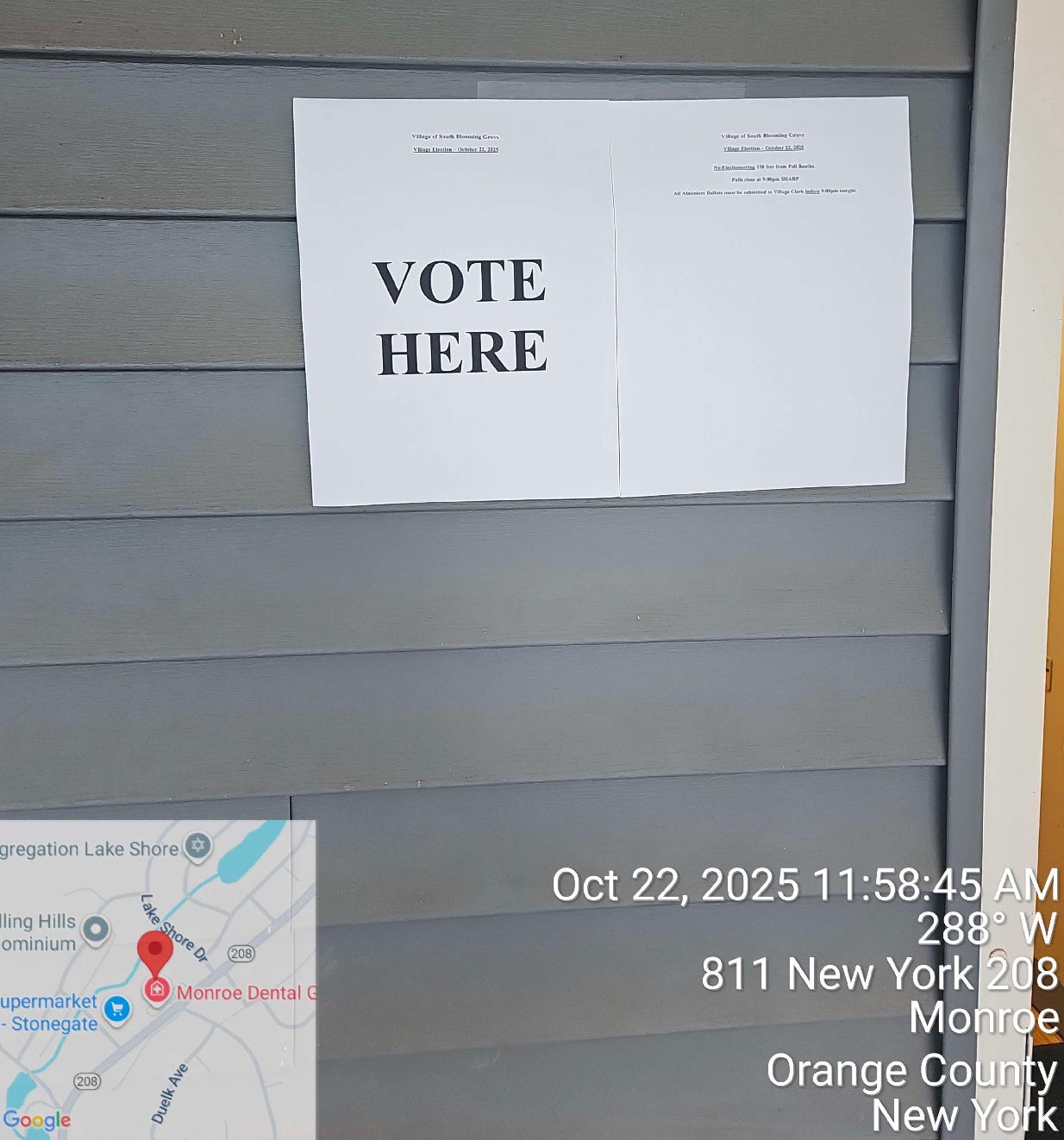 Pictured Above: Yitzchok “Isaac” Ekstein’s sign outside Village Hall on October 22nd, 2025 informing people of the location of the polls. However, residents are told to go to the fire house to vote, while others are summoned to Stern’s Rapid Care / Blooming Realty property according to residents. Like the other signs photographed by Stern and/or Ekstein, it’s not clear how long these signs stayed up after they were photographed.