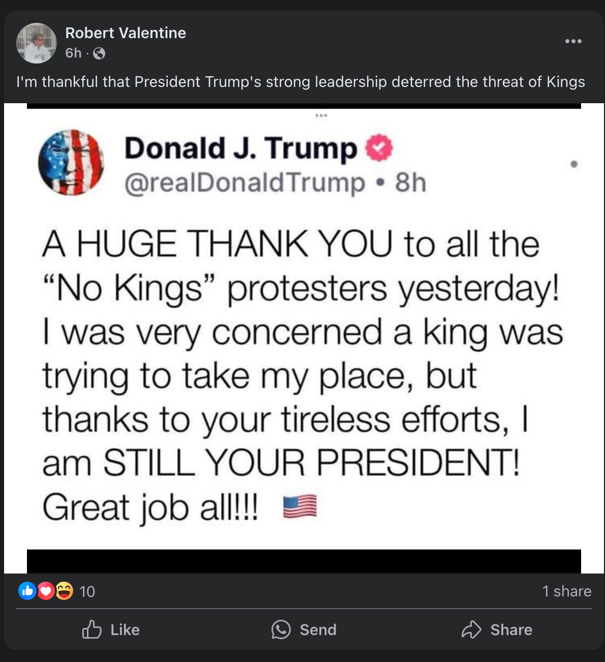 Pictured Above: This man nearly bankrupted the Town of Chester. After voters threw former Town Supervisor, Bob Valentine, out on his ass, he’s back for revenge. And he’s bringing along super cool Facebook posts like this one: