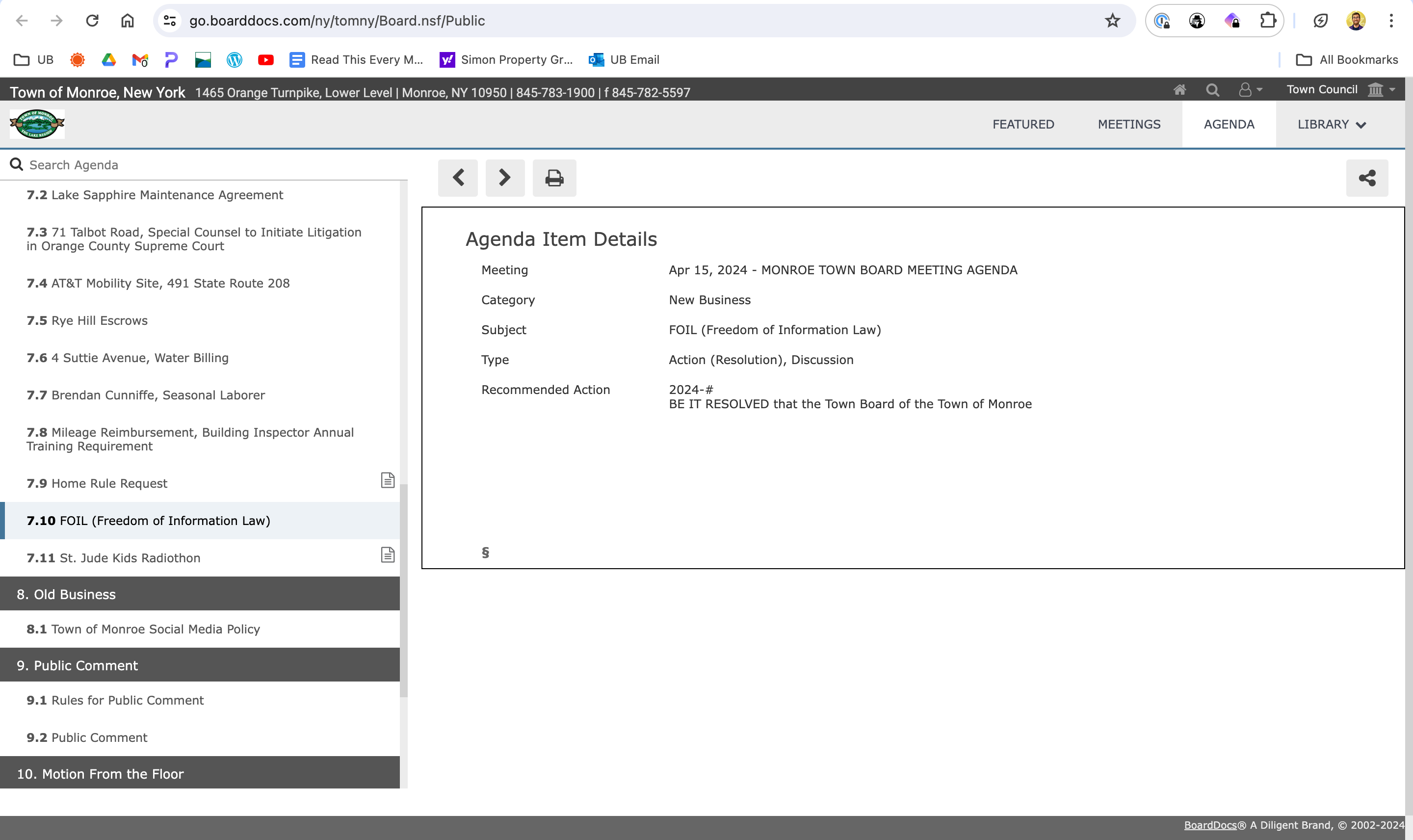Pictured Above: No information is provided concerning the Freedom of Information Law agenda item or proposed resolution. This is done to intentionally limit the public’s knowledge of what their elected officials are discussing and voting on in advance of the meeting. Town of Monroe residents should ask 2024 State Senate Candidate, Dorey Houle, why she supports such action, and whether or not they can expect the same behavior if she’s elected to the New York State Senate.