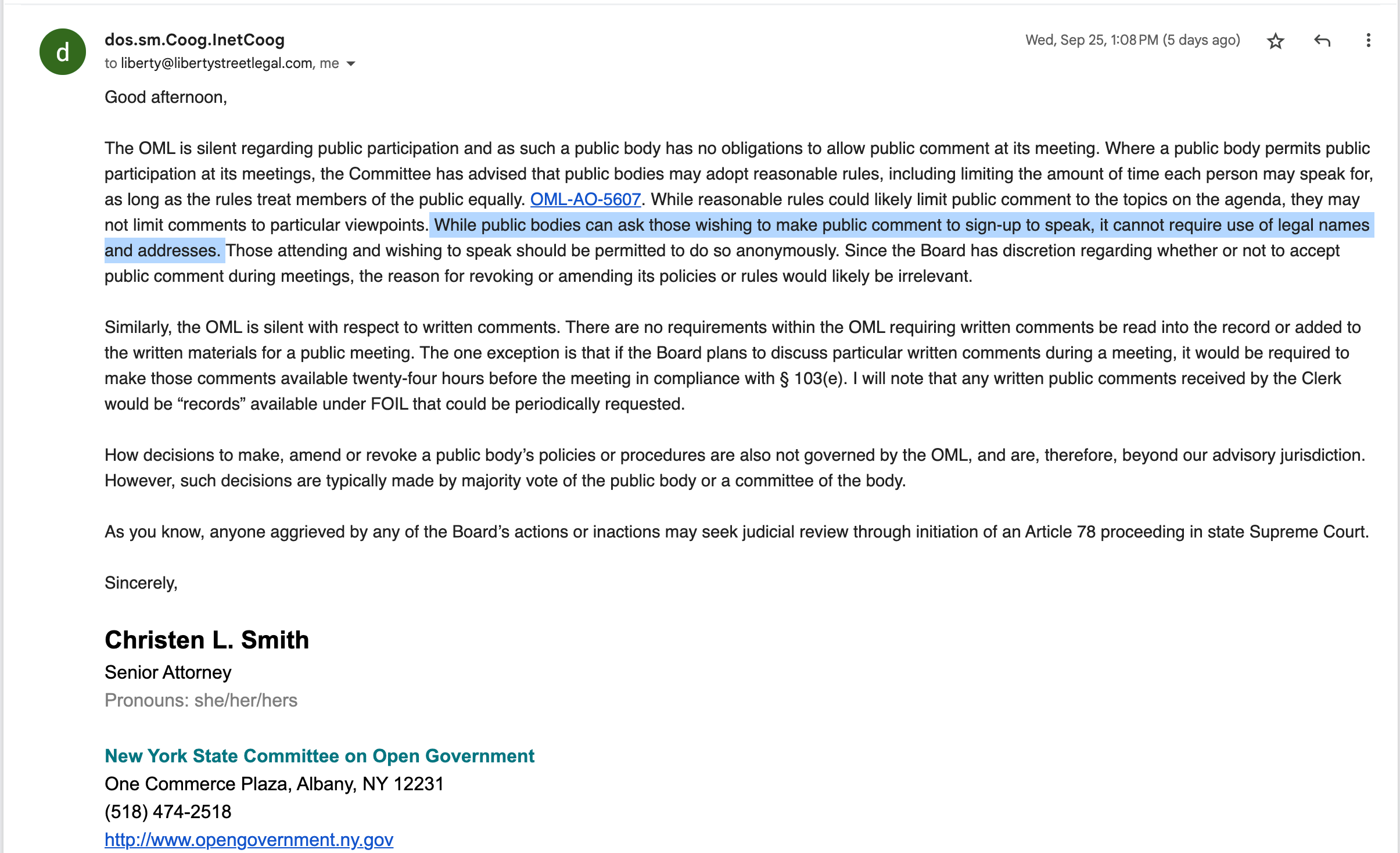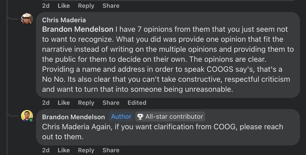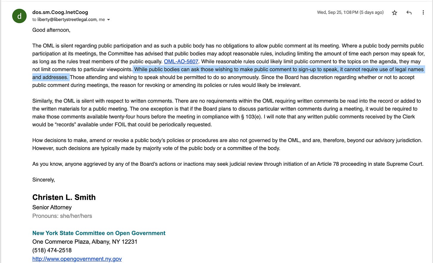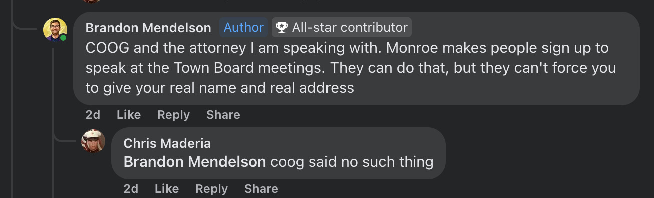 So, I’m no longer posting in the Residents of South Blooming Grove Facebook group. The moderator blew a gasket after the New York State Committee on Open Government (COOG) released an advisory opinion on South Blooming Grove, contradicting what they found online about public comment. I requested that COOG provide an up-to-date opinion. I shared their opinion with an attorney who mostly agreed with COOG, and then I published COOG’s opinion. The moderator didn’t like it, so I asked them to contact COOG for clarification, which they did not do. Instead, that person then proceeded to tell people on Facebook the quote from COOG was fake (it’s not) and that the lawyer I consulted with was bad at their job. Finally, they tried to pass off both those statements as “respectful criticism.”