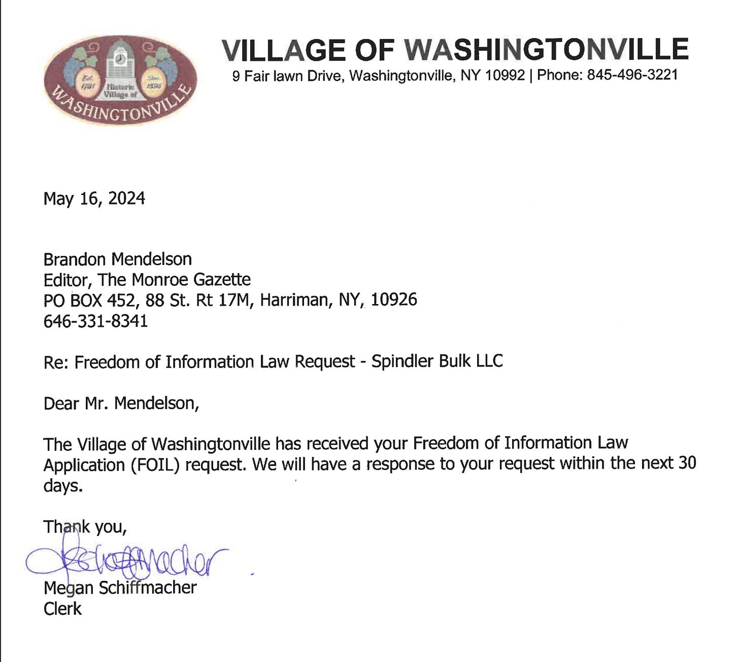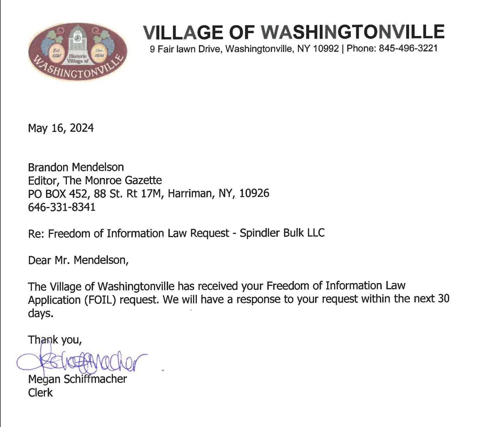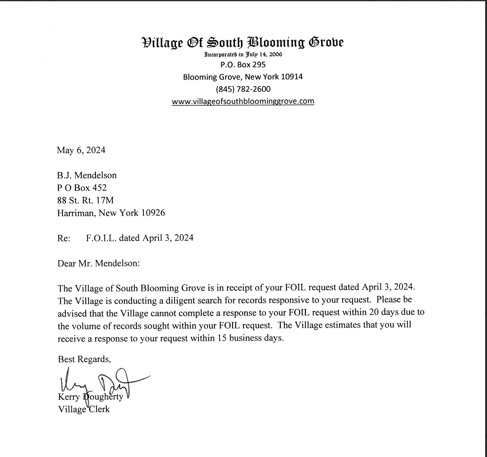 On the South Blooming Grove end of things, on April 3rd, 2024, I FOIL’ed for the following documents from the Village of South Blooming Grove: