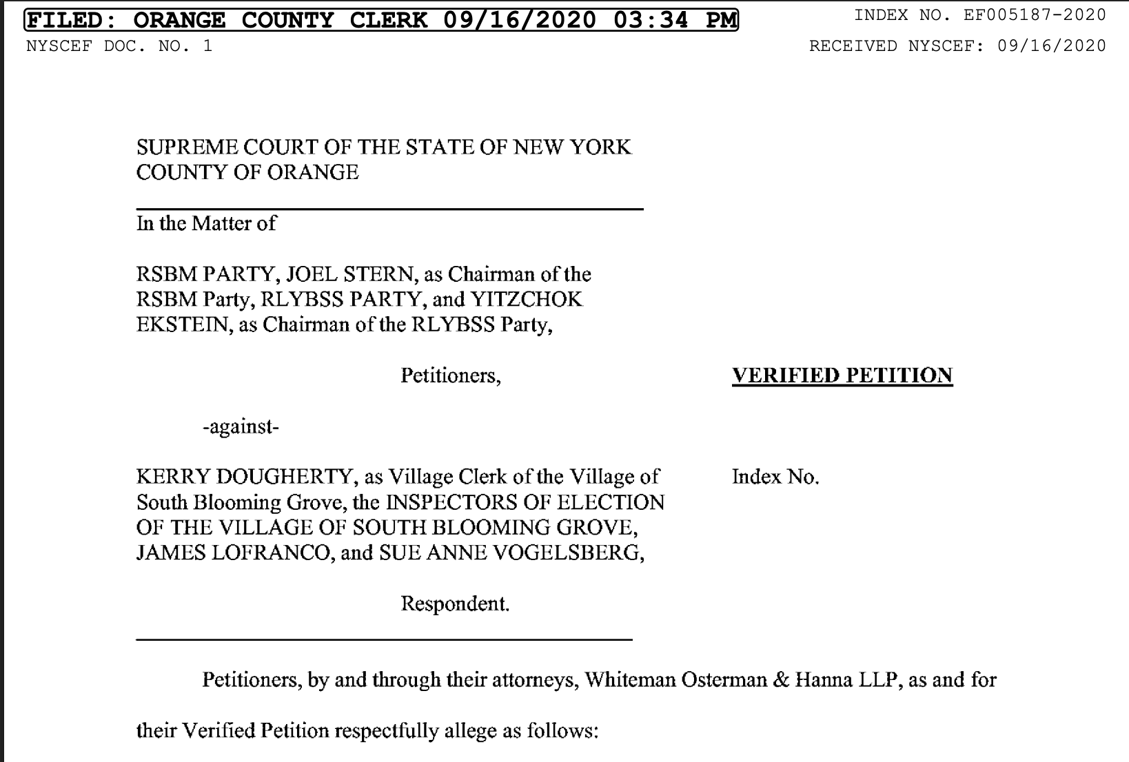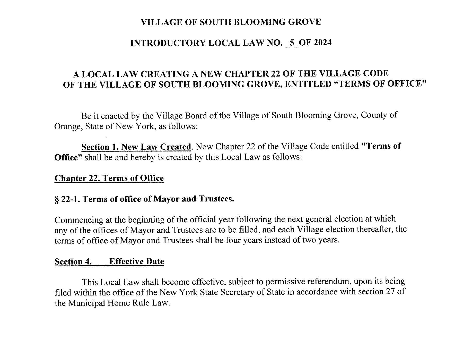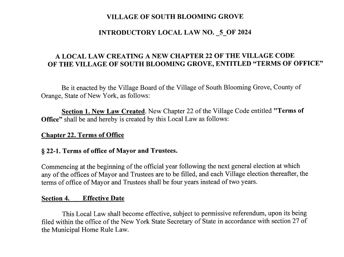In early 2021, Joel Stern and Isaac Ekstein tried to change the terms of office from two years to four years, but Kerry Dougherty, the village clerk, did not file the paperwork with the Department of State until November 2024.