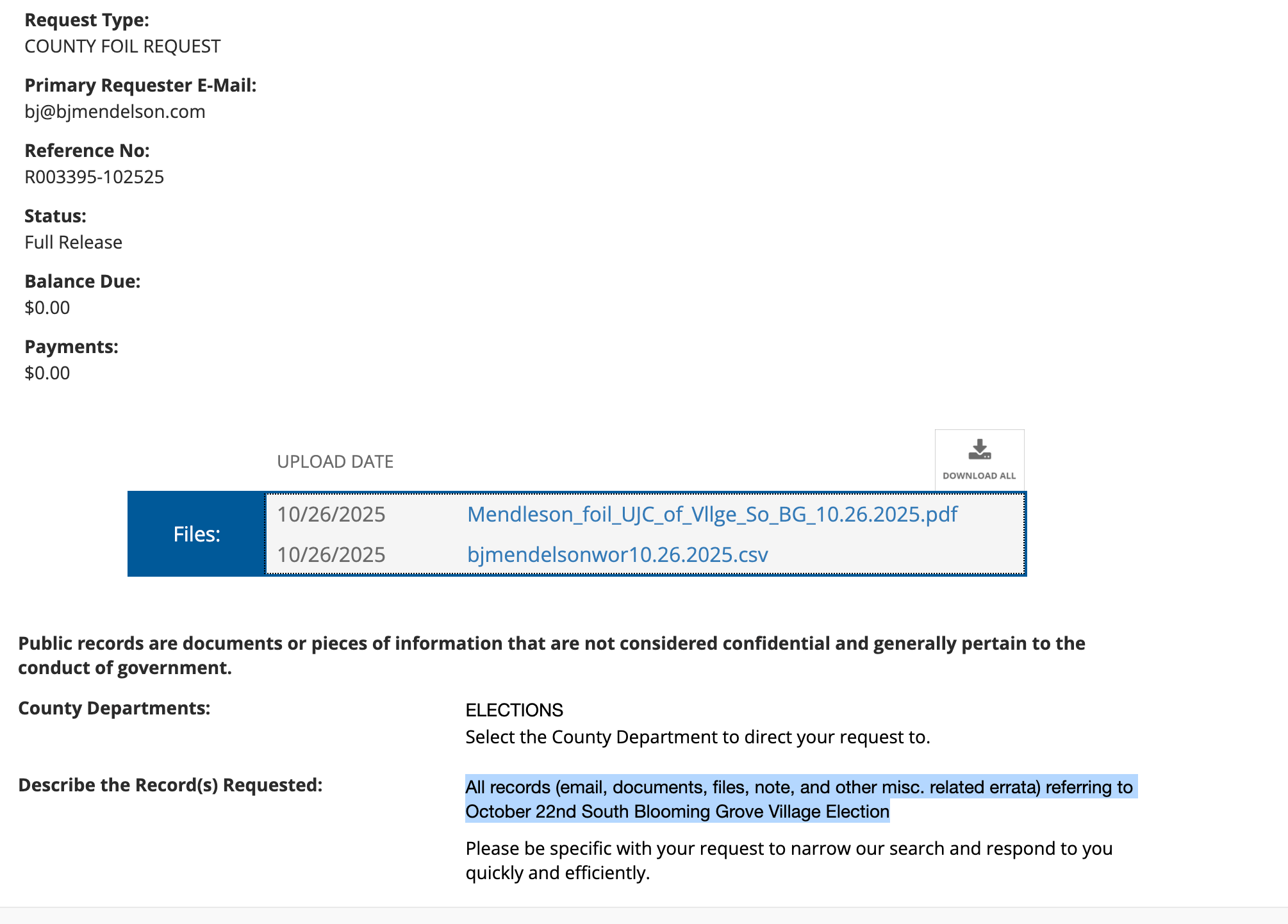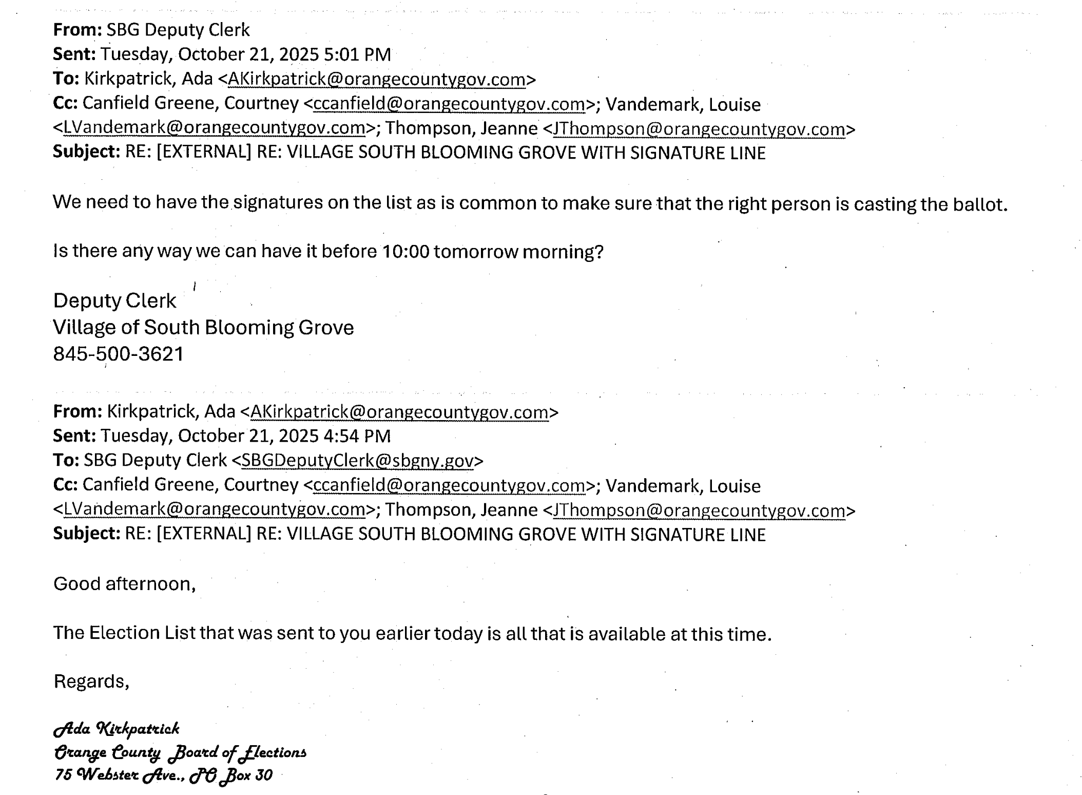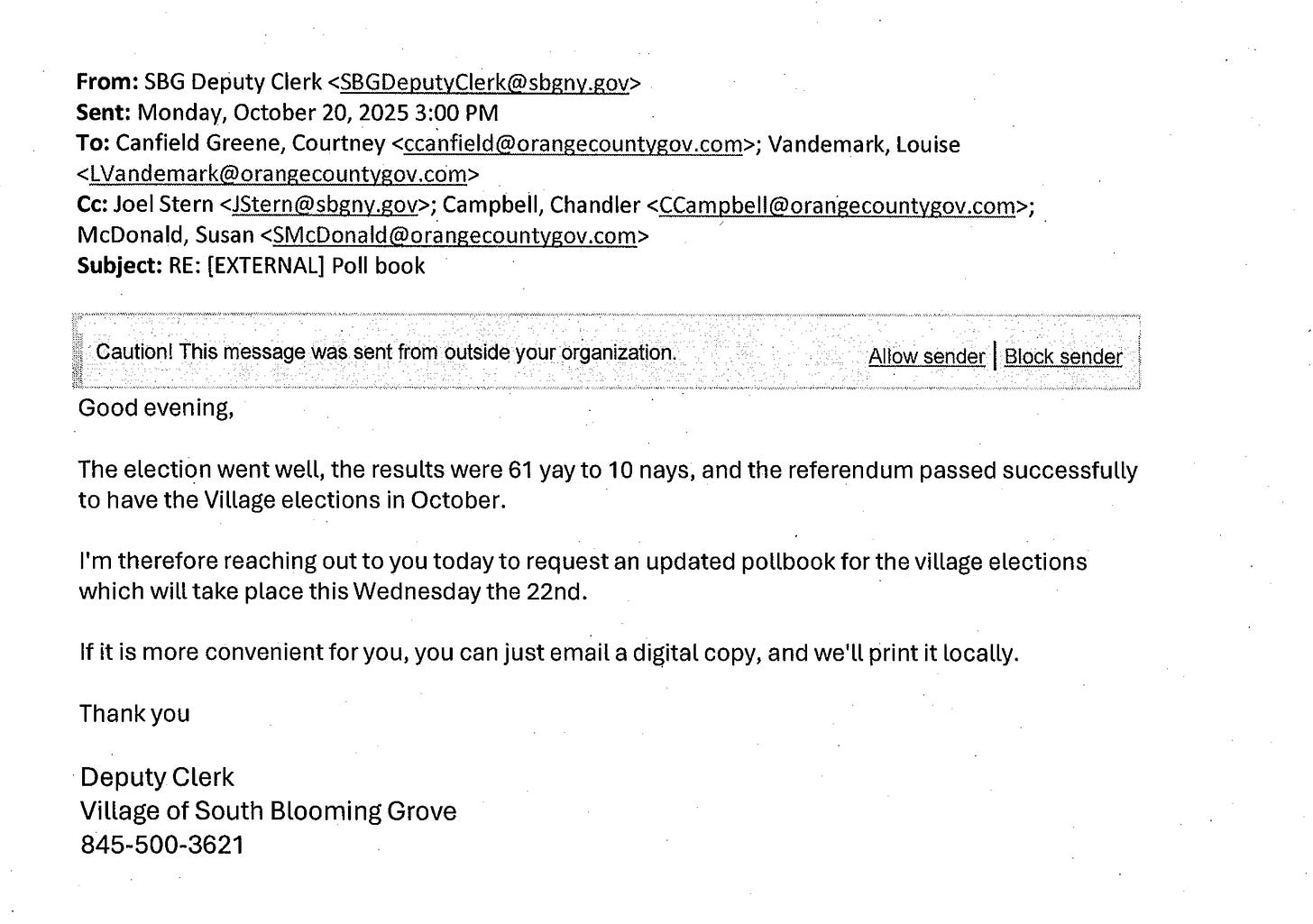 As you know, I put in a FOIL request for emails concerning SBG’s Village Election (held 10/22/25) with the OC BOE. I’d like to ask, on the record, the following questions: