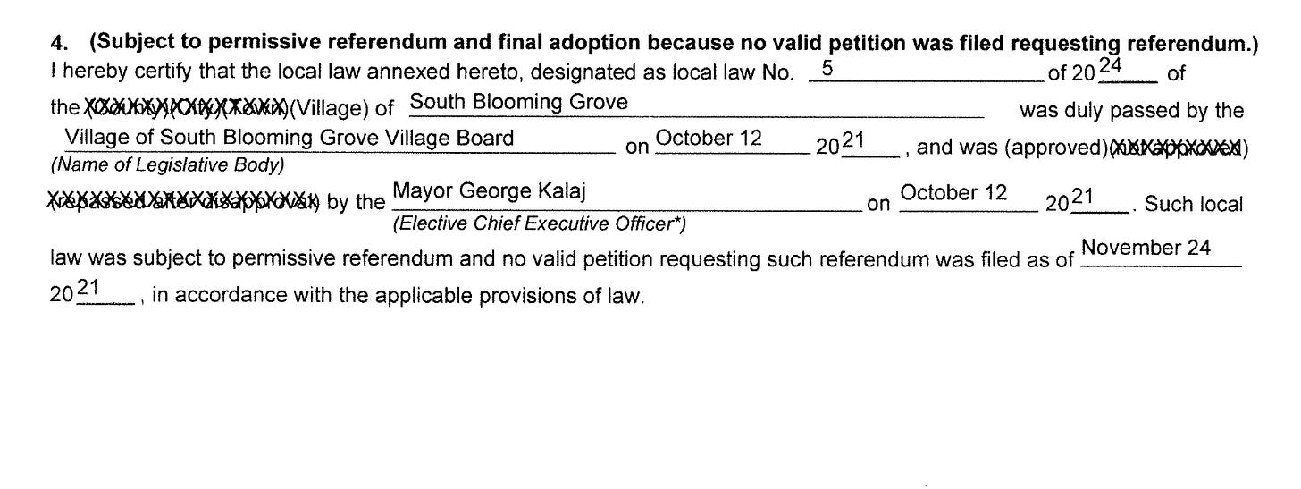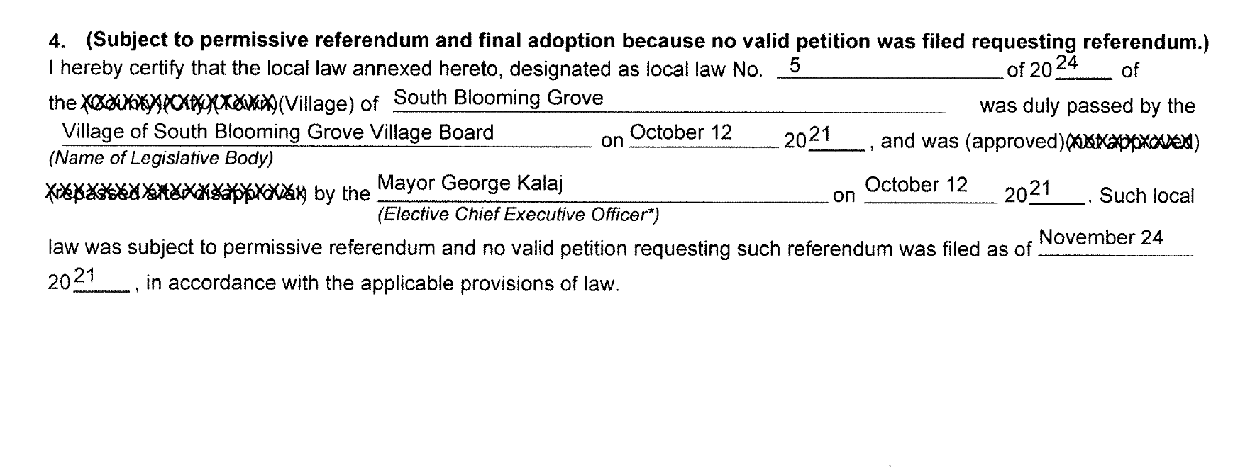 Below is a brand new, potentially never-before-seen or voted on, “updated” Local Law from 2024. The Village of South Blooming Grove was not exactly forthcoming in how this new local law came about. Nor does Local Law 5 of 2024 appear in any 2024 meeting agendas or minutes that we have found thus far.