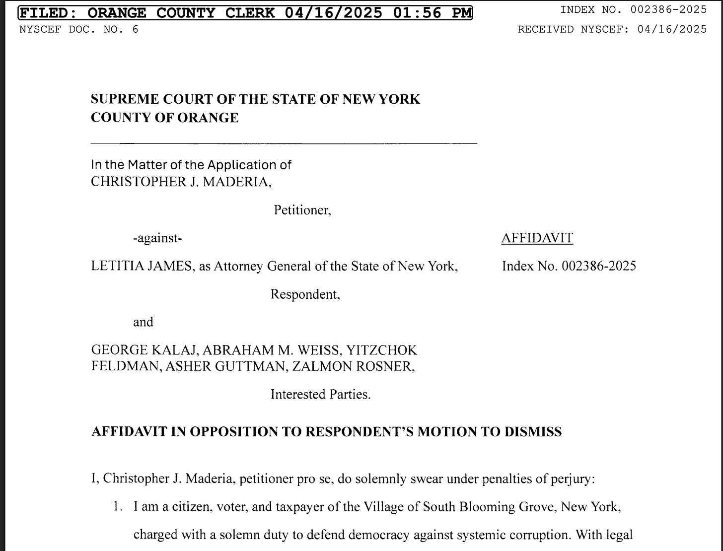 4. On Feb. 20, 2025, Joel Stern testified in a lawsuit between Orange County and the village of South Blooming Grove, stating that Mayor Kalaj’s term of office expires in March 2026. This matters because Stern’s sworn testimony is part of the record; given prior instances where Stern has been accused of false statements under oath (see our coverage of his activities in Union Township, N.J.), his statements should be treated with caution. (Just a note about Stern’s activities at 601 Lehigh Avenue in Union, New Jersey. Stern worked for Jacob Gold at a company called Windsor Global. Jacob Gold is the second largest shareholder in the Clovewood project behind the developer, Ziggy Brach.)