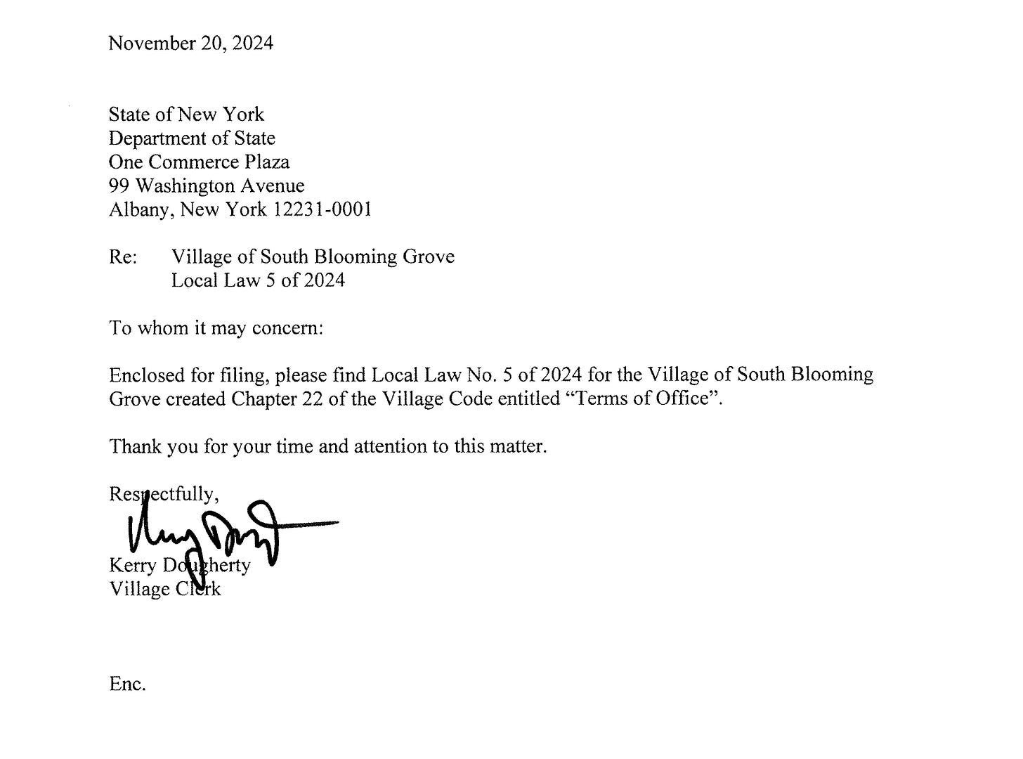 Second, the village attempted in 2021 to change the terms of office from two years to four years, but it did not file the required paperwork with the Department of State until late 2024.