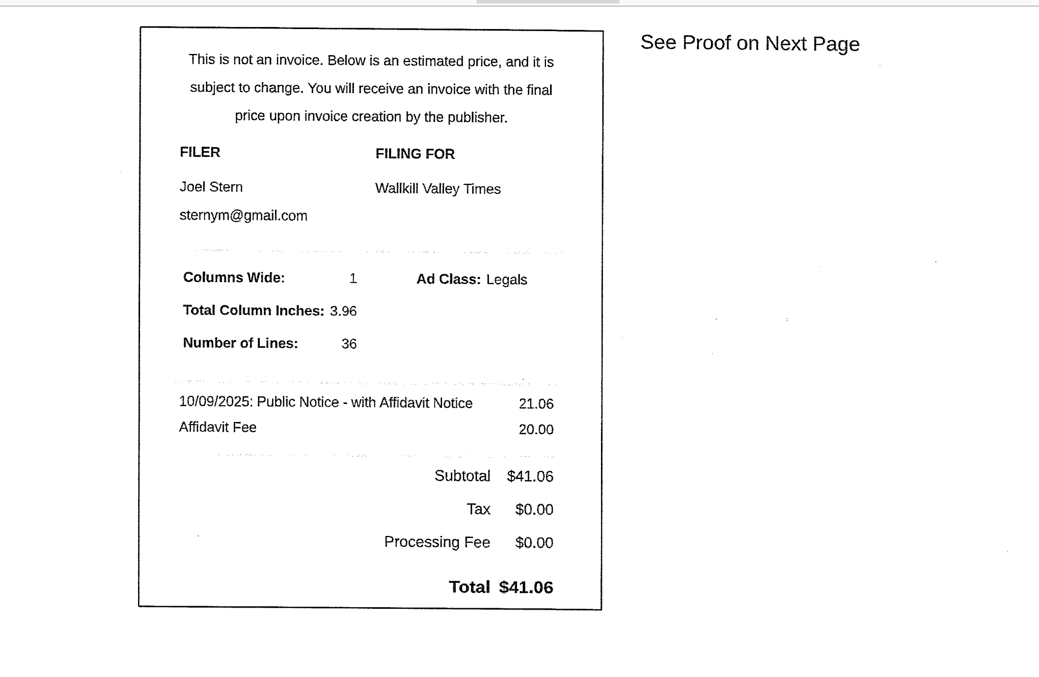 6. On Oct. 9, 2025, Joel Stern — from his Gmail account — sent an ad to the Mid-Hudson Times announcing the Oct. 22, 2025, election. The Mid-Hudson Times provided a copy after searching their records; we thank them for their help.