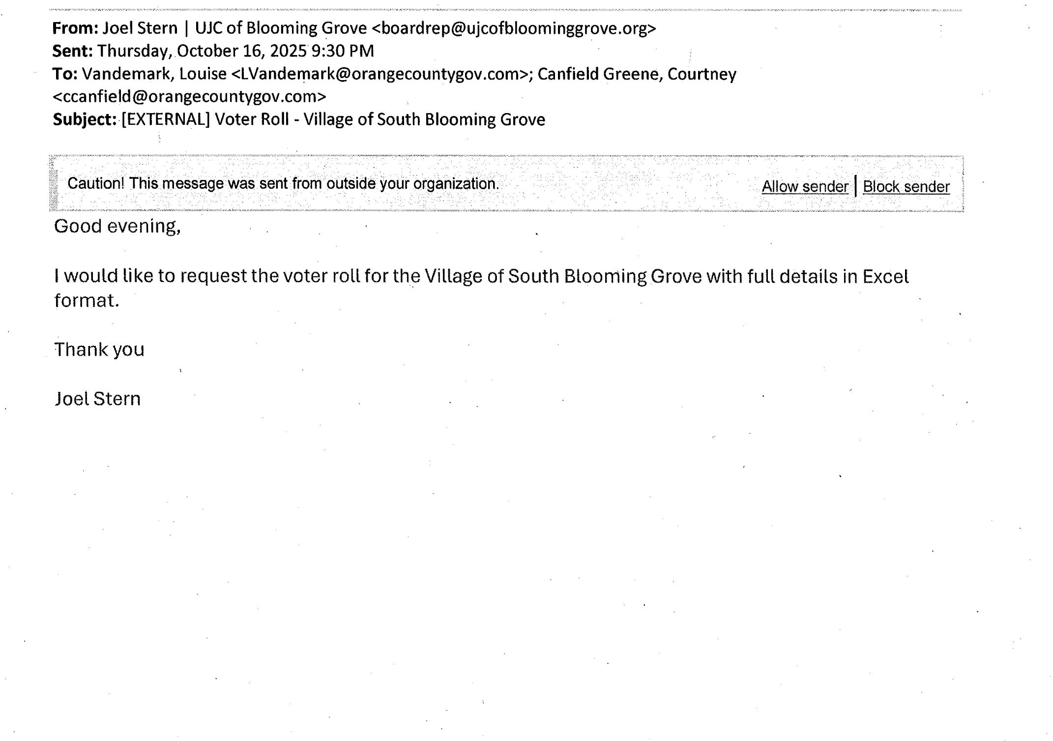 8. On October 16th, from his United Jewish Community in Blooming Grove email, Joel Stern asked the Orange County Board of Elections for a complete voter roll for South Blooming Grove.