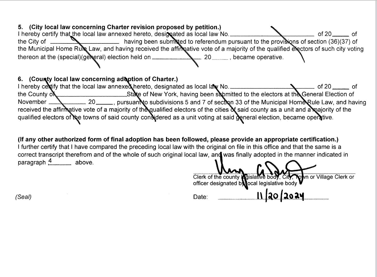 Five months later, the 2021 Terms of Office changes are filed with the Department of State in November of 2024 with a new name. At NO POINT does this new Local Law, Local Law 5 of 2024, ever appear on any 2024 agenda to be voted on or approved.