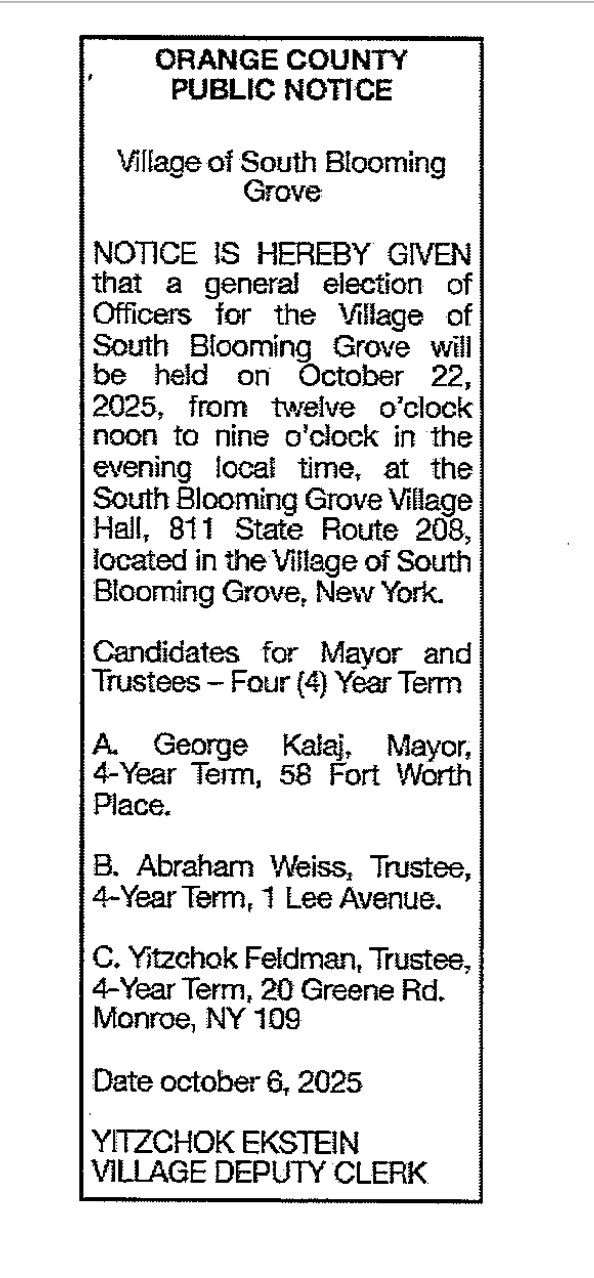 Notably, the ad publicly identifies Isaac Ekstein for the first time, to our knowledge, as deputy village clerk of South Blooming Grove — a development we will examine in future reporting. (We’ve asked the Village of South Blooming Grove for proof that this ad did run.)