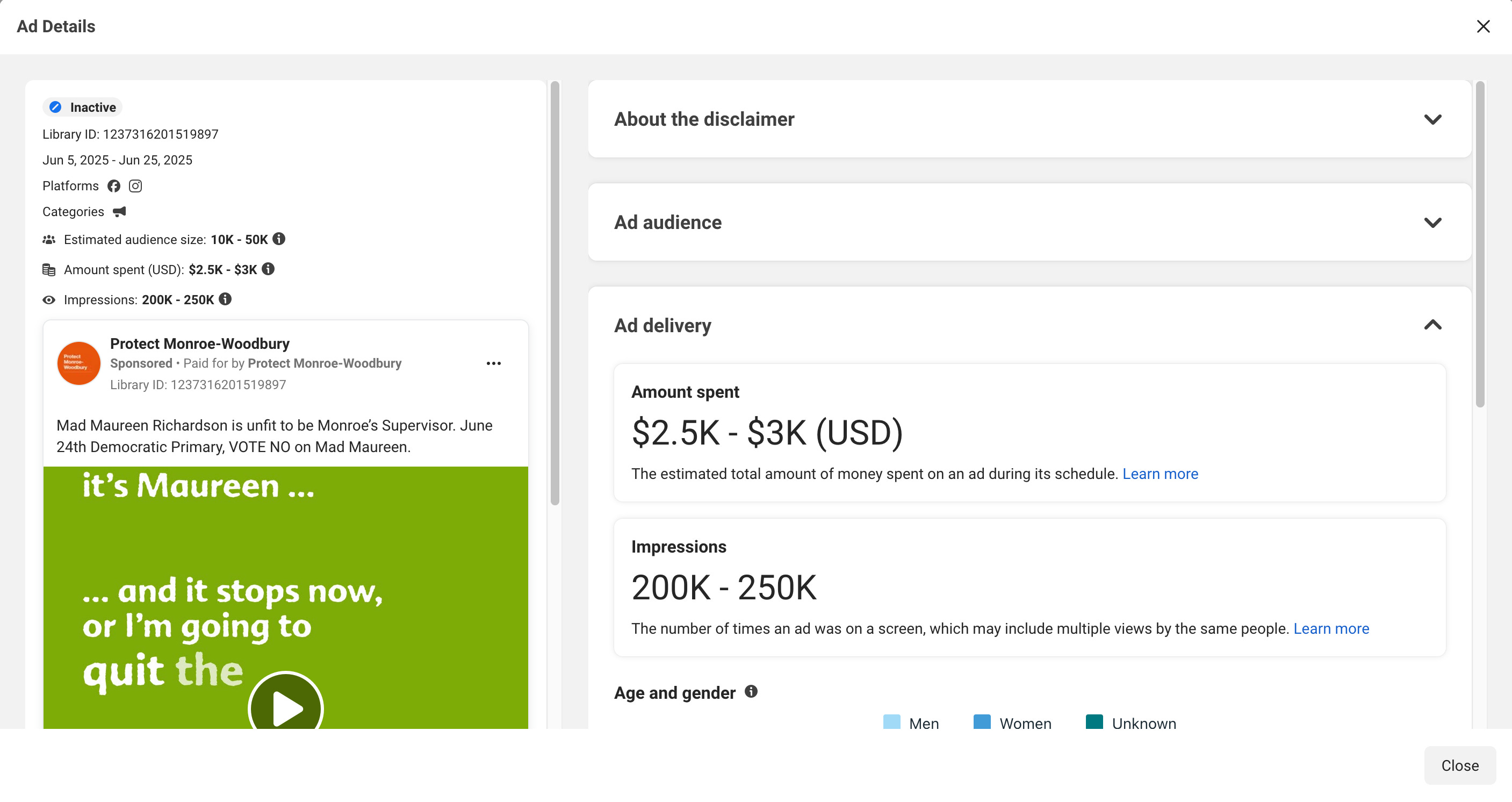 Mr. Skoufis spent about $3,000 to attack Richardson according to records found within Facebook’s Advertising Library. Skoufis tried to defame Mrs. Richardson by taking out of context a voice mail she left for him where Richardson told Skoufis to stop harassing her. (As of this writing, the website for Protect Monroe-Woodbury is no longer active, but the voice mail can still be found in the Advertising Library.)