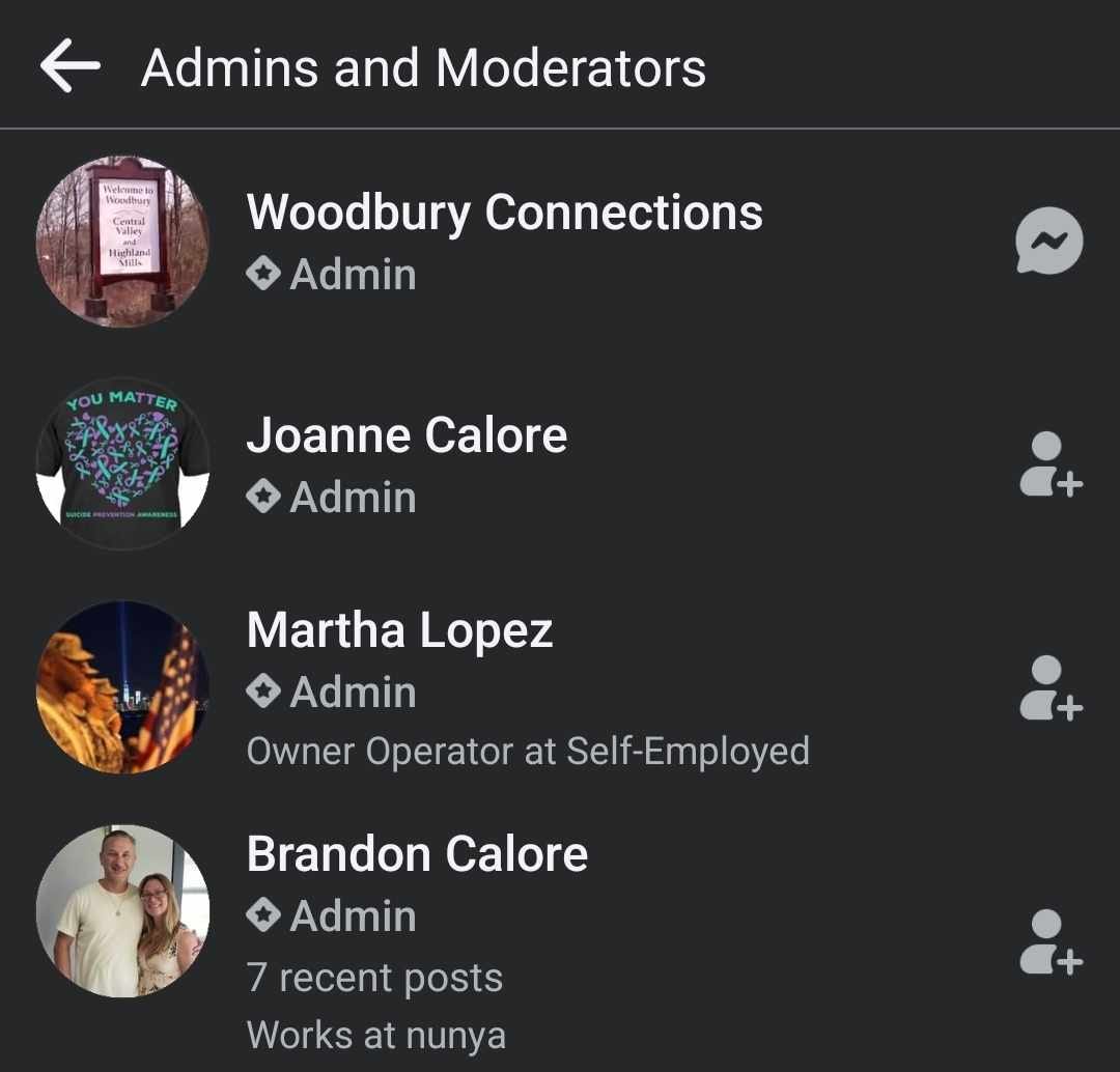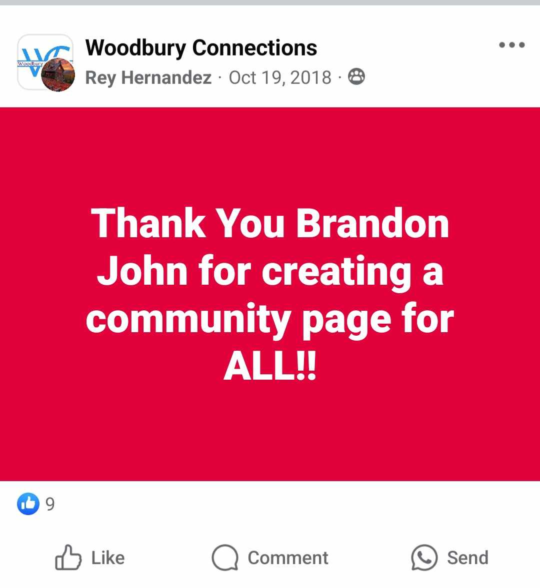 Woodbury Town Councilman Brandon Calore is the owner of a Facebook Group called Woodbury Connections. Here he is, being thanked for starting the group back in 2018:
