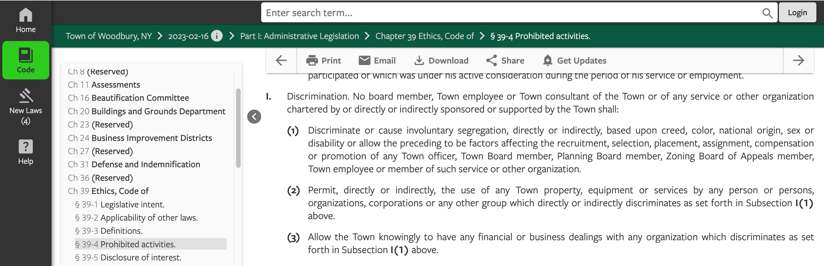 Despite recent changes to the Town of Woodbury Ethics Code, at the time of this writing, there is still a section in there prohibiting discrimination or association with groups allowing for discrimination: