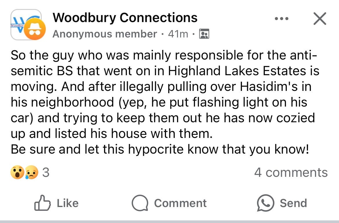 -It also implies malicious intent on the part of the Haredi community in Woodbury, which the Town Board member represents.