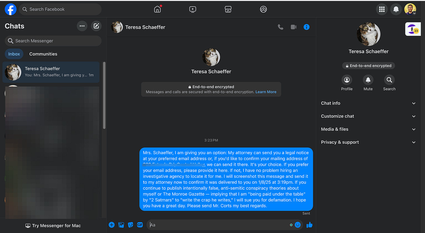 Mrs. Schaeffer, I am giving you an option: My attorney can send you a legal notice at your preferred email address or, if you'd like to confirm your mailing address of (removed), we can send it there. It's your choice. If you prefer your email address, please provide it here. If not, I have no problem hiring an investigative agency to locate it for me. I will screenshot this message and send it to my attorney now to confirm it was delivered to you on 1/8/25 at 3:19pm. If you continue to publish intentionally false, anti-semitic conspiracy theories about myself or The Monroe Gazette — implying that I am "being paid under the table" by "2 Satmars" to "write the crap he writes," I will sue you for defamation. I hope you have a great day. Please send Mr. Corts my best regards.