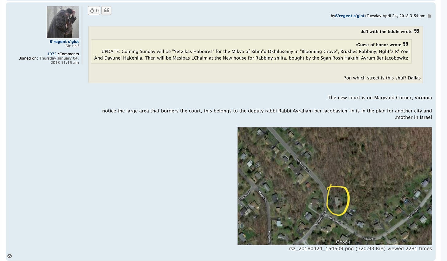 Above: Screenshot from the Yiddish-language message board, Ivelt.com, detailing a plan to create a new town at the current United Jewish Community headquarters in 2018. That same year, United Jewish Community founding member, and slumlord, Moche Halpern purchased 26 Virginia Avenue, which is part of the Green Area situation.