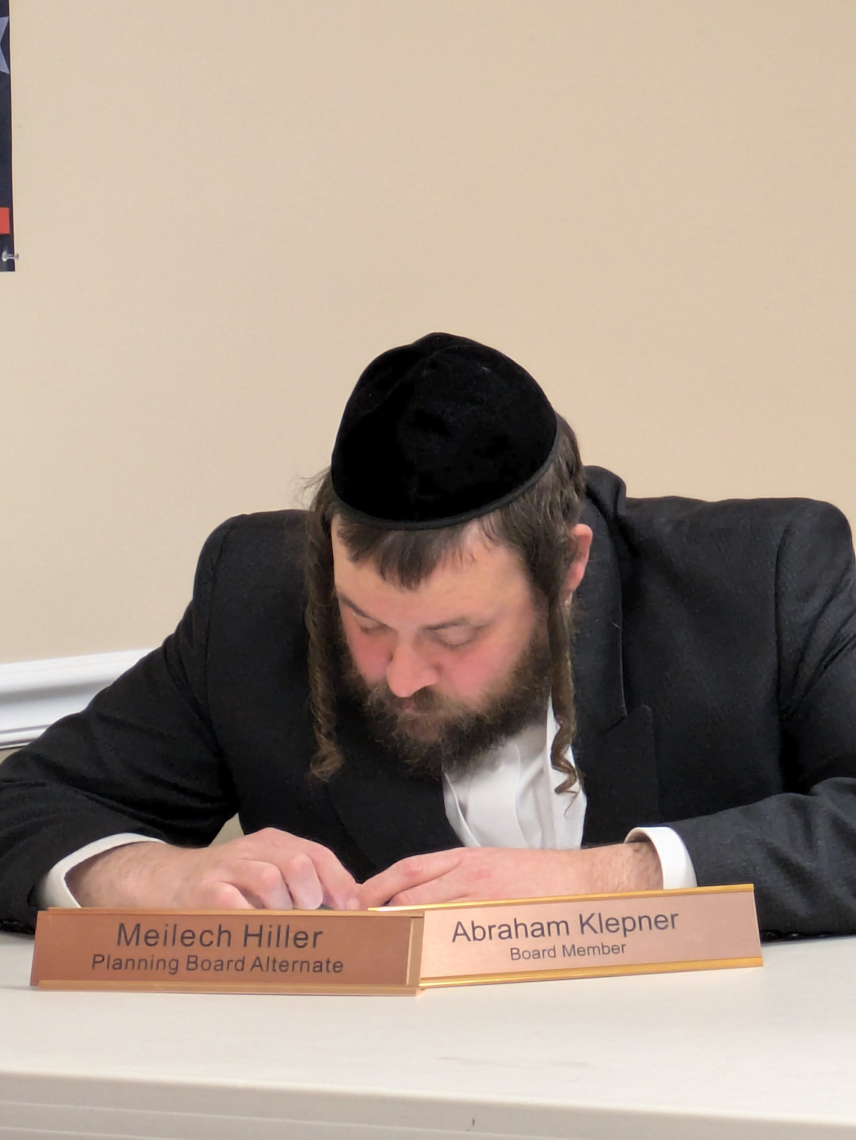 Above: After taking office, South Blooming Grove Mayor George Kalaj illegally fired the Planning Board members. He did this without notice or reason provided for their dismissal. Mr. Abraham Klepner, pictured above, was appointed to the board. At last night’s meeting, Mr. Klepner spent almost all of it playing on his phone, much like his friend on the Zoning Board, Sholem Leiberman, did.