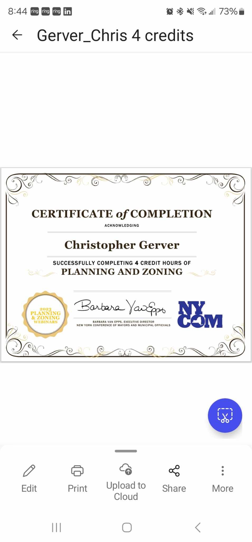 Above: Since Mr. Chris Gerver — Woodbury’s Planning Board Chair — had his credentials called into question by Trustee Freiband last night, Mr. Gerver was kind enough to send The Monroe Gazette the above image. The image above verified that Mr. Gerver is indeed credentialed and qualified to serve on the Planning Board as the Chair, despite Mr. Freiband’s slanderous claims.