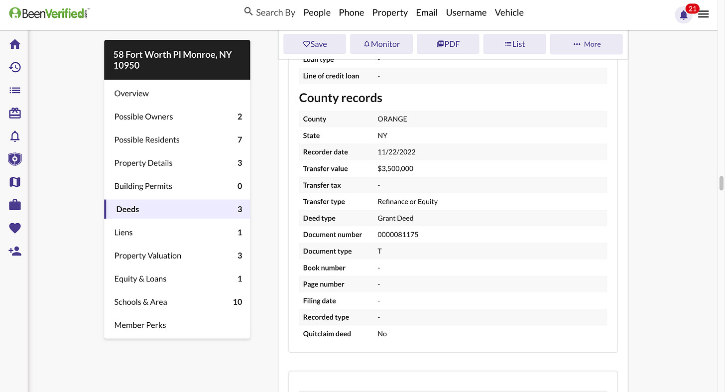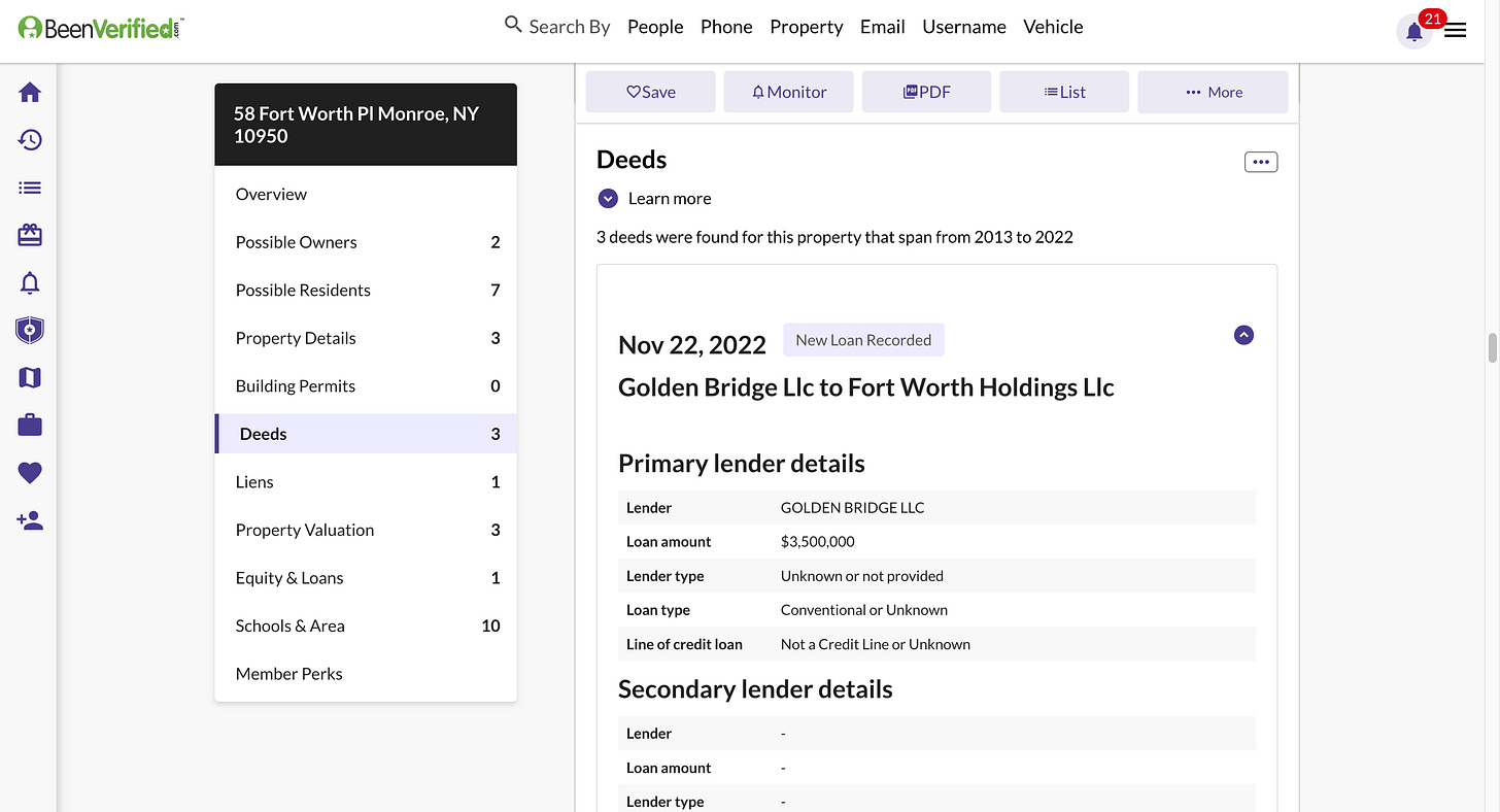 At the end of February 2022, a company called Fort Worth Holdings LLC was created. A week later, Fort Worth Holdings purchased the home of South Blooming Grove Mayor, George Kalaj. Mayor Kalaj’s home was valued at $464,300.00 by Orange County. The home was purchased for at least $4.6M, but potentially for as much as $7.5M. This purchase took place just prior to the village election, in which Mayor Kalaj ran unopposed for a second term. Later that year, an Israeli company known as Golden Bridge LLC loaned Fort Worth Holdings LLC $3.5M, potentially covering nearly the entire reported purchase price of Mayor Kalaj’s home.