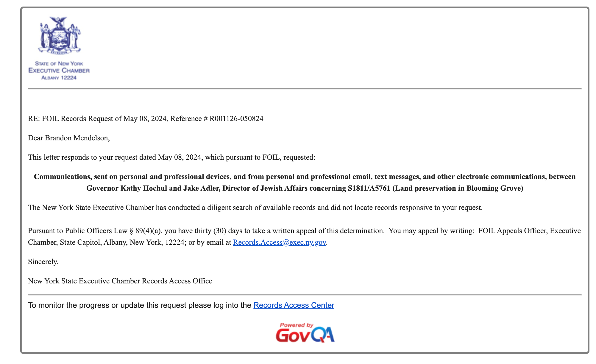 This is interesting because Governor Hochul’s office is saying there was NO communication between Jake Adler, Director of Jewish Affairs, and the Governor concerning S1811/A5761, which was the bill to allow a land preservation tax in Blooming Grove.