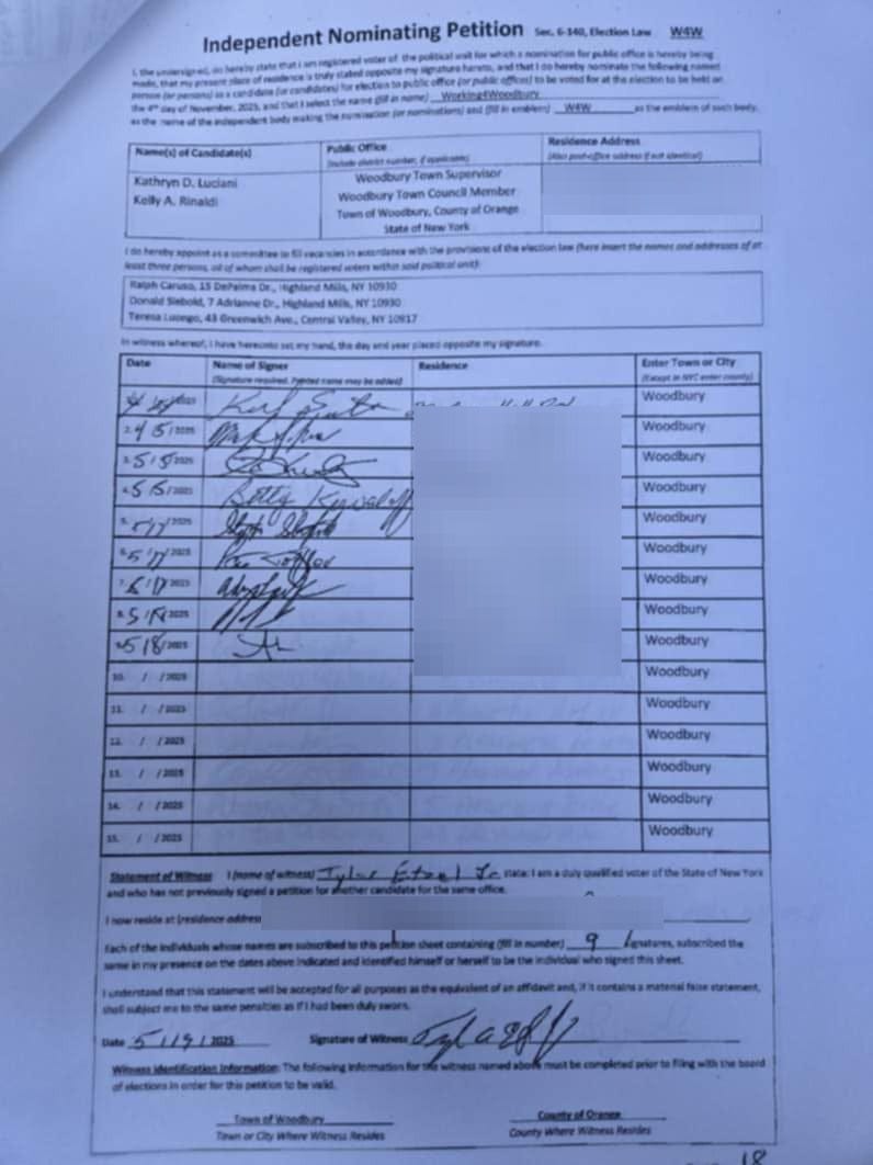 P.S. If you doubt that the Committee to Elect Woodbury Democrats are working with James G. Skoufis’s BFF, Clovewood Kathryn (Supervisor Kathryn Luciani, who took money from Clovewood developer Ziggy Brach during her previous attempt at running for Assembly) look real close at who’s names are on the following petitions for Luciani’s 3rd party ballot line, “Working4Woodbury.”